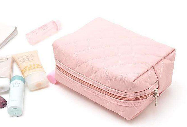Consider a makeup bag that can stand on its own and still provide room for the contents. Large oblong or rectangular makeup bags can be bulky and take up a lot of space. Small and soft makeup bags can be burdensome when trying to fumble through it to find your favorite mascara. Save time by purchasing a makeup bag that has a top zipper and a flat bottom.