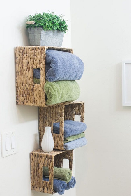 Don't actually have a linen closet in your bathroom? No problem. Attach baskets to the wall for a spot to fold extra towels and washcloths.